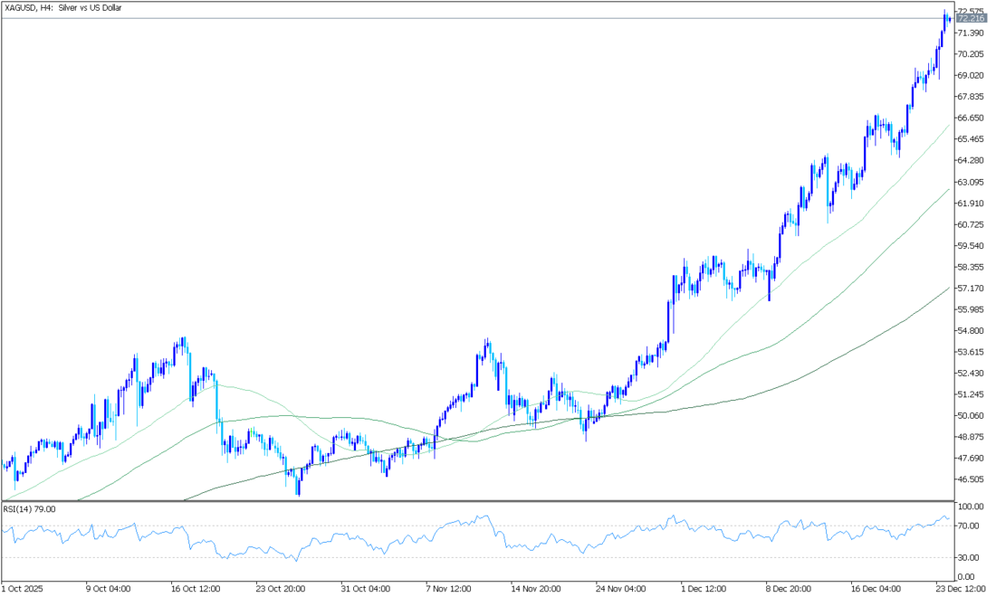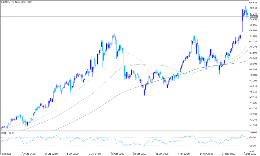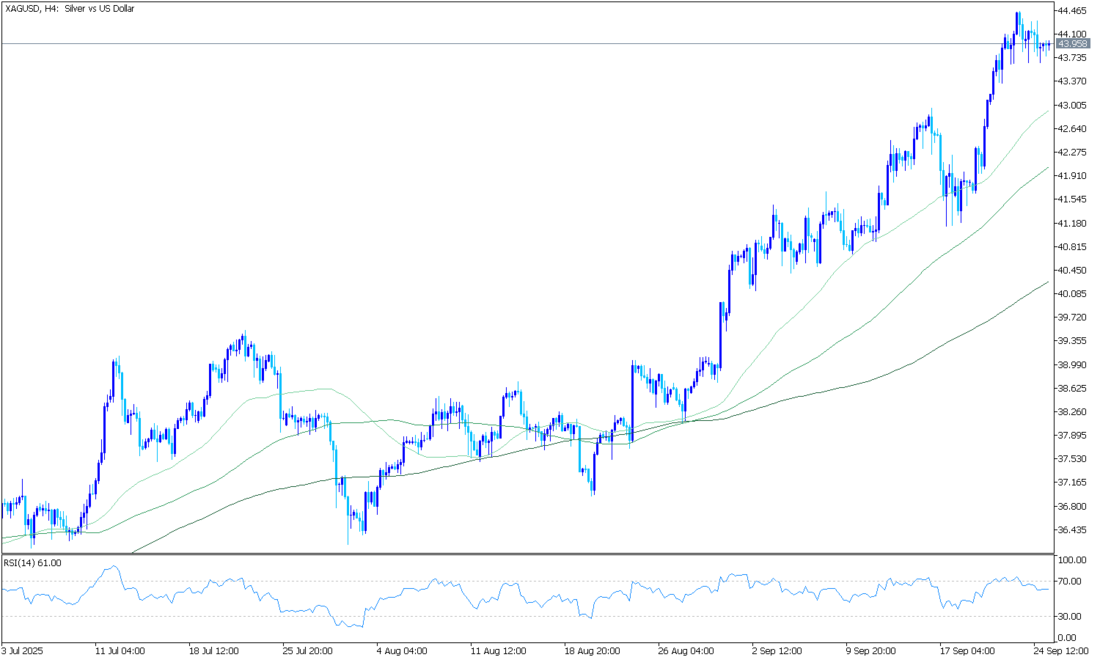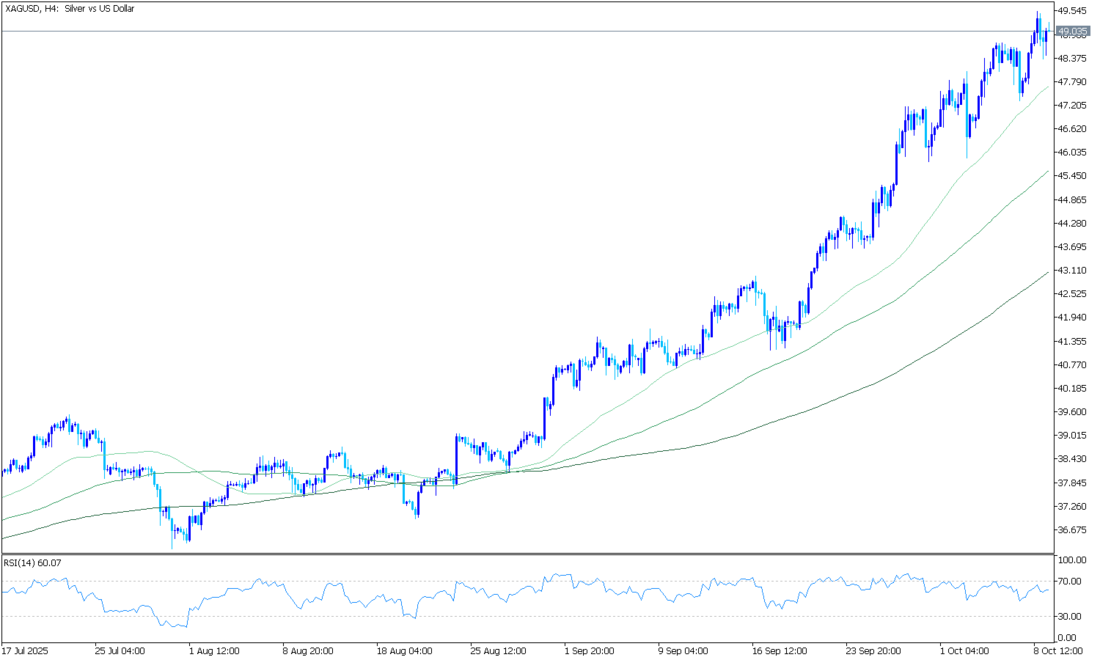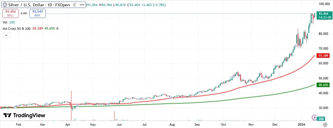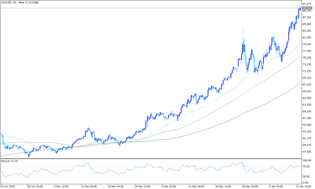 Gümüş fiyatı (XAG/USD), iki günlük kayıpların ardından toparlanarak, işlem saatlerinin başlarında 94,15 dolar ile yeni bir rekor seviyeye ulaştı. Şu anda, gümüş fiyatı Pazartesi günü Avrupa saatlerinin başlarında ons başına yaklaşık 93,70 dolar civarında işlem görüyor. Günlük grafik zaman diliminin teknik analizi, değerli metalin fiyatının yükselen bir kanal formasyonu içinde kaldığını ve sürekli bir yükseliş eğilimini gösterdiğini ortaya koyuyor.